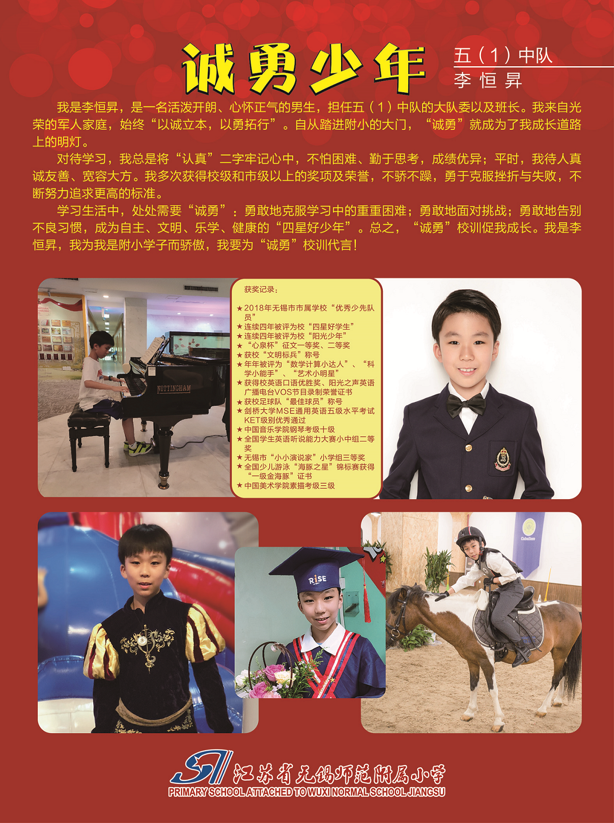 五(1)李恒昇:忠于我们的祖国,热爱她,追随她,永怀一颗赤胆忠心,这就是我对“诚勇”校训的理解。我是李恒昇,践行诚勇校训,做诚勇少年!