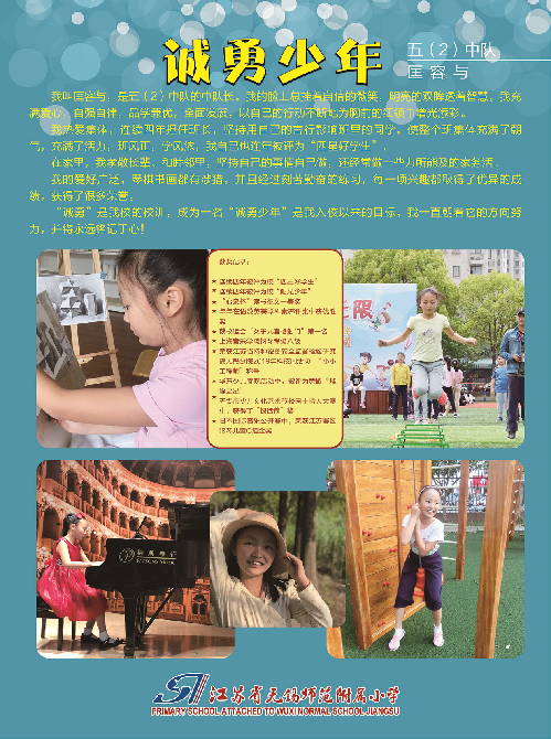 五(2)匡容与:古人云“精诚所至,金石为开。”诚勇也是待人真诚的意思。真心诚意,坦诚相待。我是匡容与,践行诚勇校训,做诚勇少年!