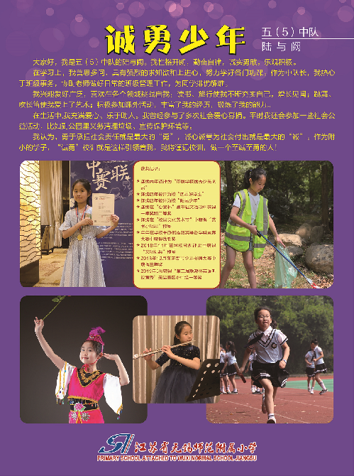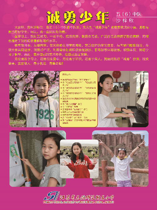 五(6)沙梓欣:我热爱科学,乐于探究,敢于打破常规,勇于用自己的智慧去探索、去发现。这是“诚勇”校训给予我的养分,让我们一起勇于创新,创造更美好的明天!我是沙梓欣,践行诚勇校训,做诚勇少年!