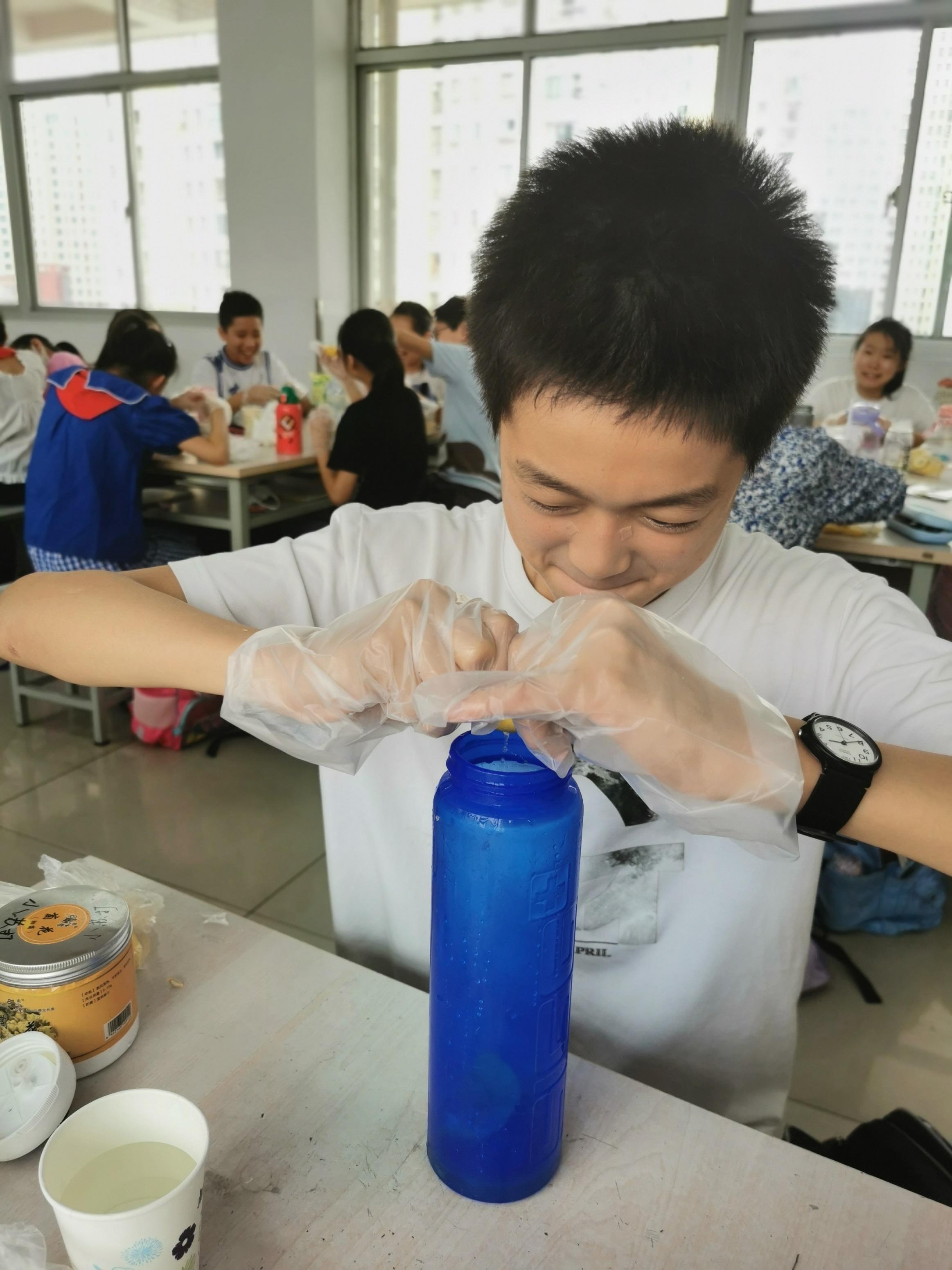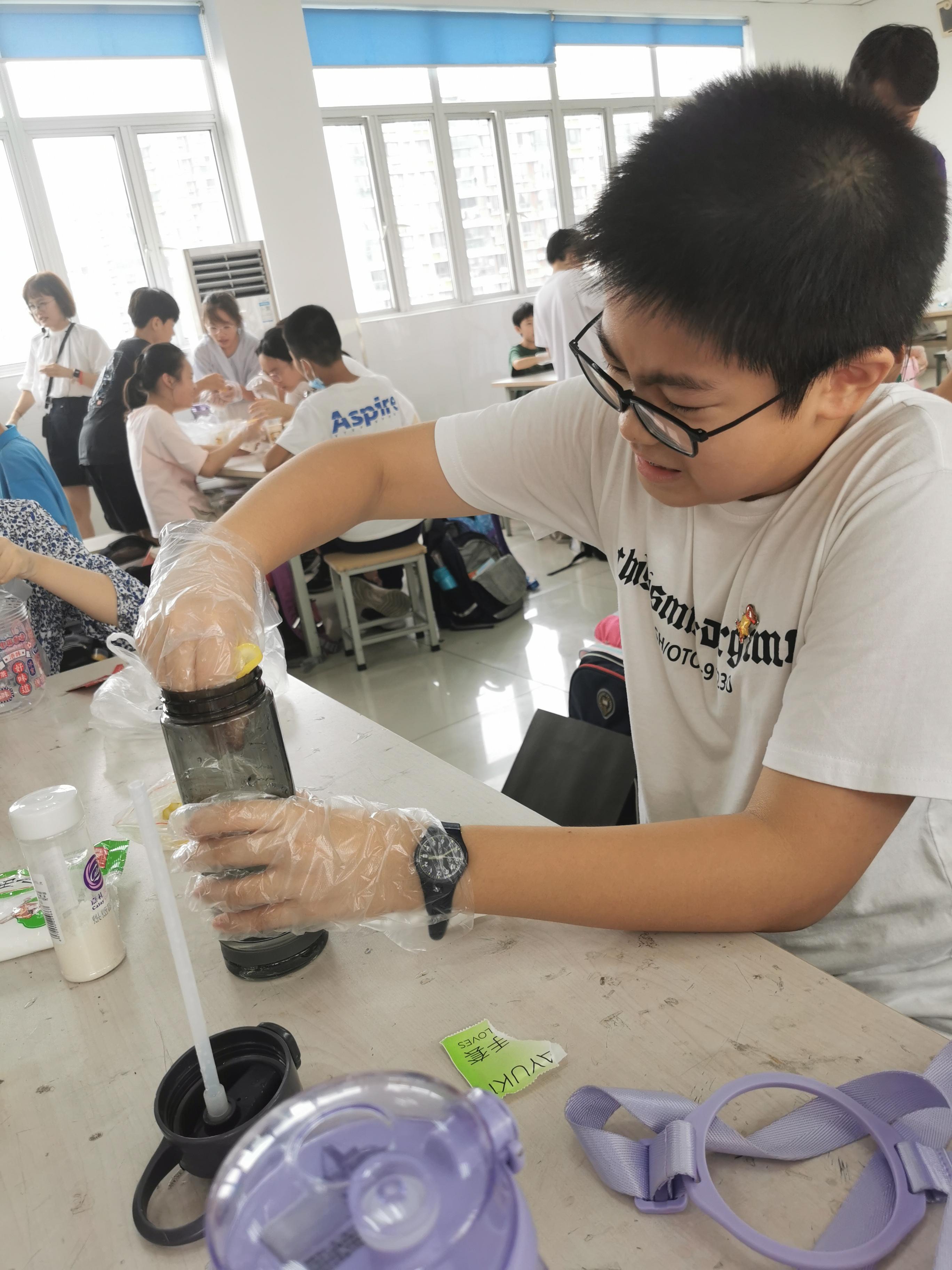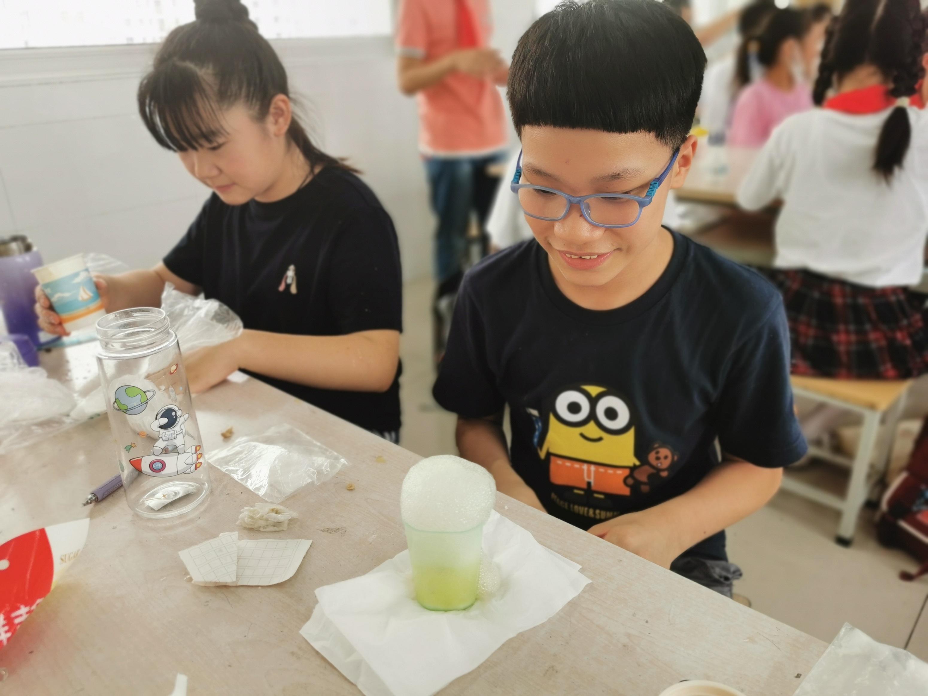 六年级的同学首先学习了制作汽水背后的相关专业知识,在老师的引导下合理设计动手环节,利用自带的水果、小苏打、蜂蜜、食用色素等材料,通过小组分工合作完成了“快手”汽水的制作,最后亲自品尝“劳动成果”体验到成功的喜悦。从理论落实到实践,再从实践结果返回核心的知识概念,形成了一个完整的学习闭环,充分体现出了新课标科学课程的学习要义。