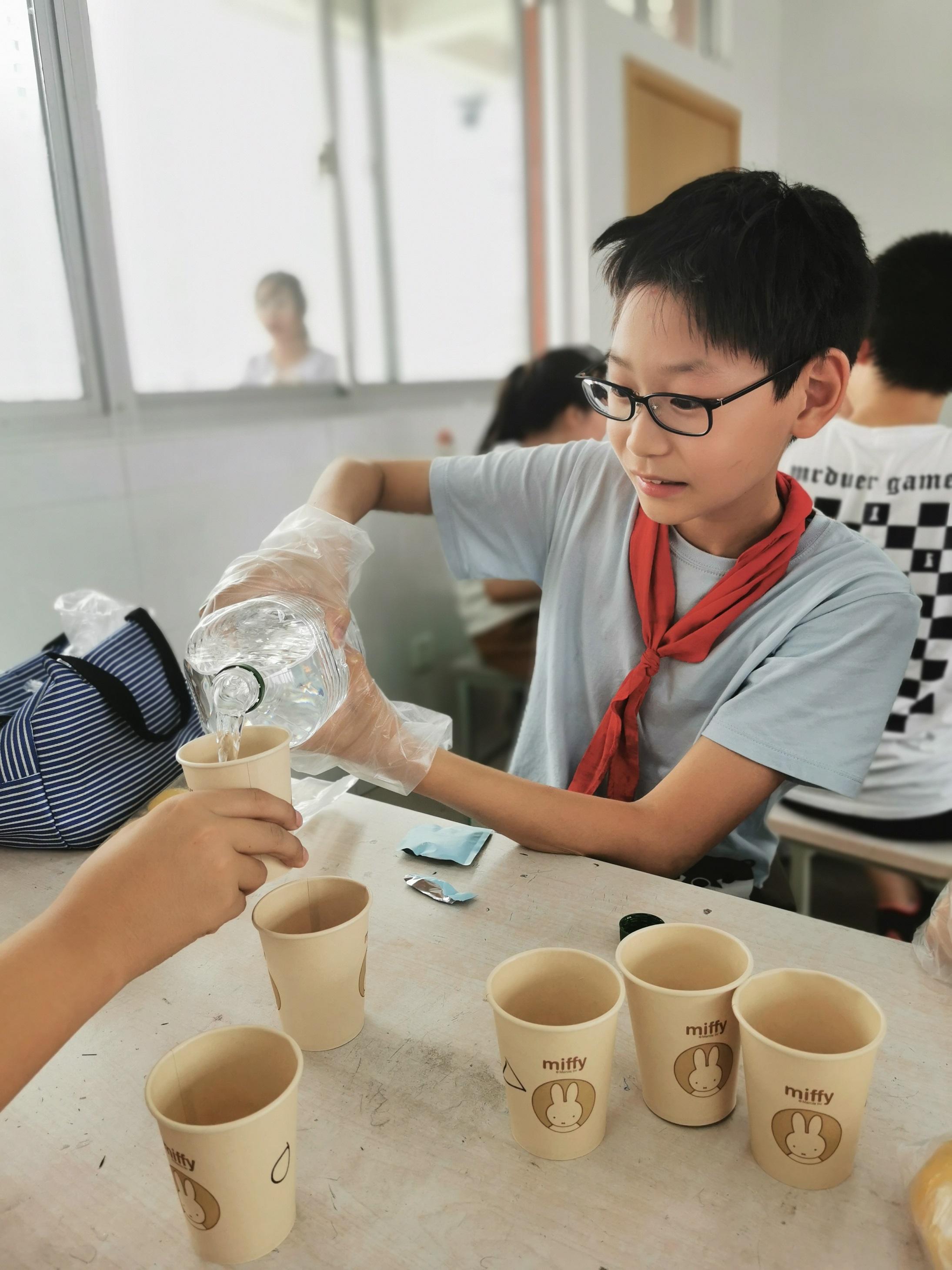 新学期四年级的孩子们开启了“升与毫升”的学习,这是充满生活趣味的数学知识。老师们精心设计活动带领孩子们开展了多学科融合的“寻找生活中的升和毫升”的实践活动。找一找生活中以升、毫升做单位的容器;量一量常见容器的容量;做一做1升的量器;调一调调出能演奏乐曲的“杯琴”。啊,原来数学和生活这么紧密!啊,原来数学中还藏着科学!啊,原来音调还可以这样奏出……