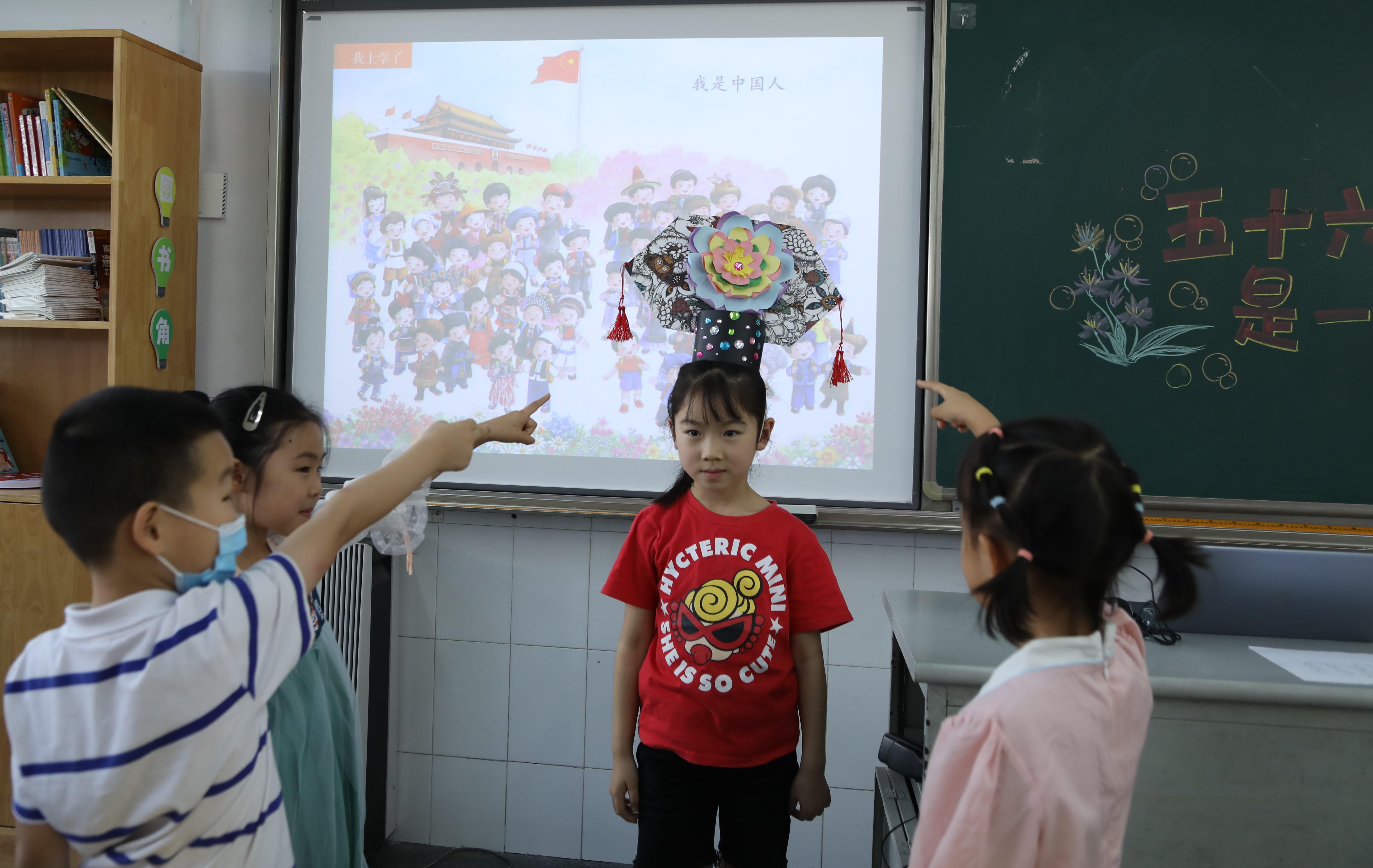 瞧,一年级的小萌新翻开语文书,就被祖国的五十六个民族吸引了!争着、抢着来说一说、猜一猜、秀一秀、尝一尝。