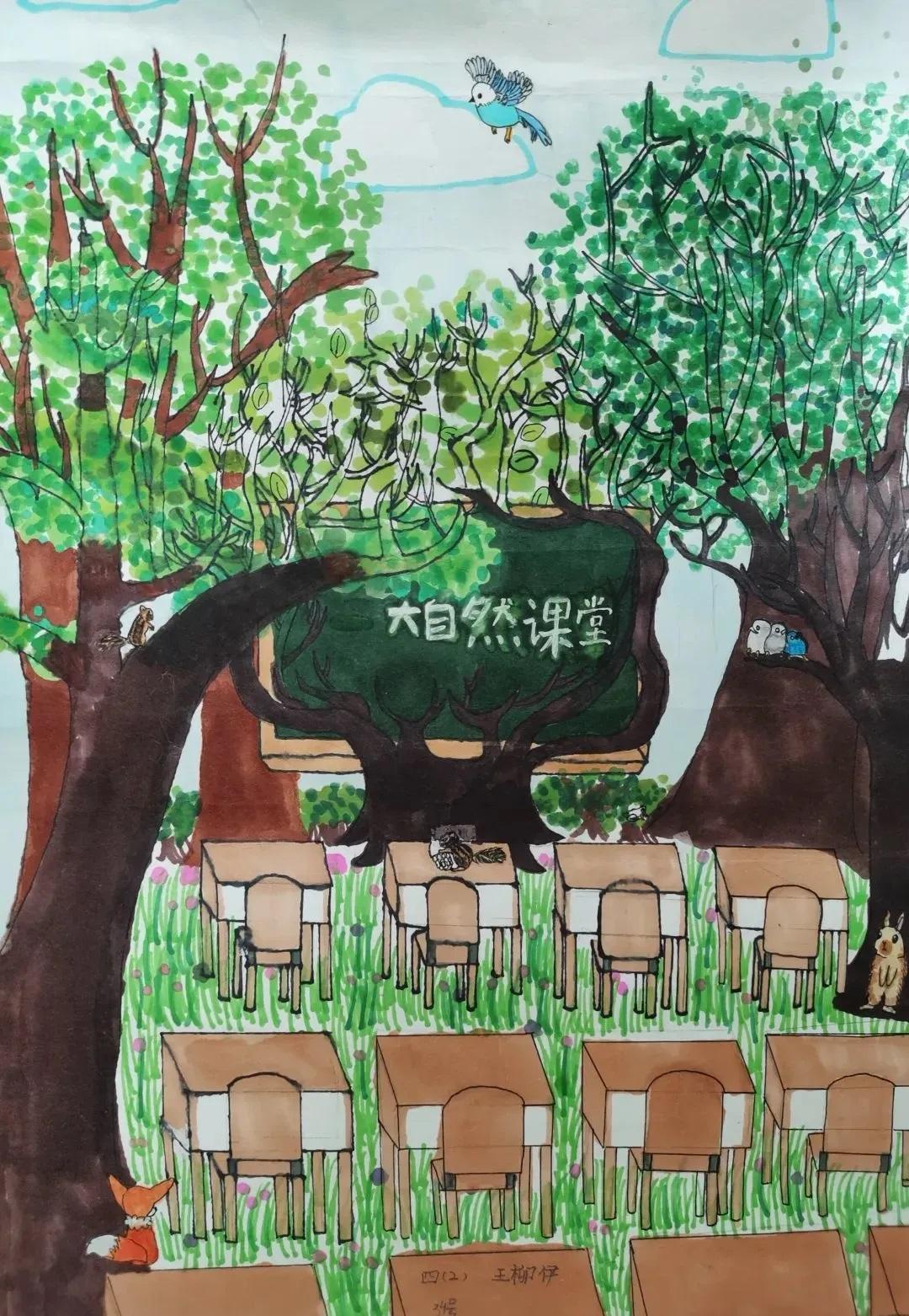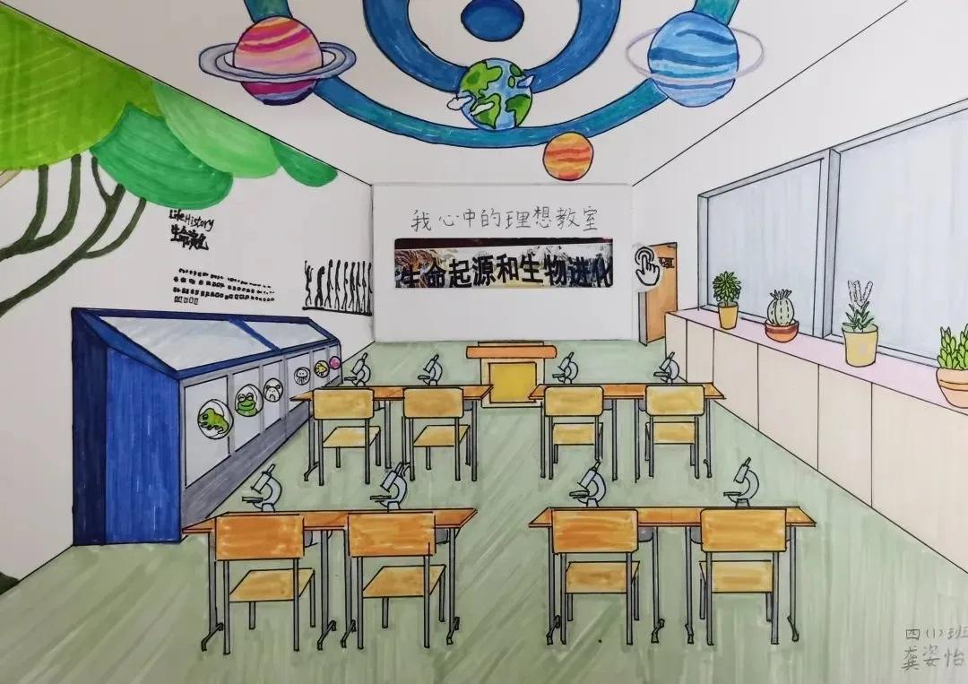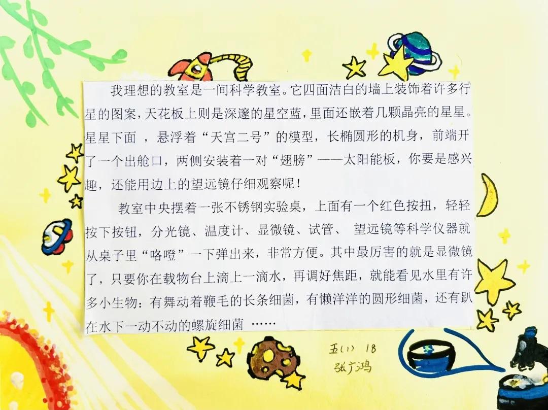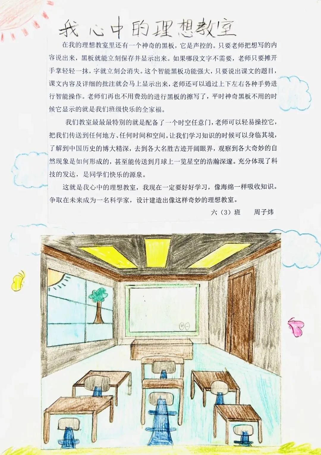 “我的理想教室有两层。一楼除了常规教室功能外,布置着一些六边形课桌,它们方便随意移动组合:上课时,可以分散开来;集体讨论时,又可以组成环形,老师站在中间,所有同学都能近距离观察老师的展示。二楼教室由奇妙书屋和科学实验室组成。书屋设置有一些书柜、沙发供同学们阅读时使用。这儿有座小木屋,当你读书累了的时候,可以在这小憩。科学实验室的墙面带有太空元素,实验桌上放置了实验工具和电脑等。在这里,同学们可以尽情探索科学奥秘,在老师的指导下制作有趣的模型,完成各种科学实验。”