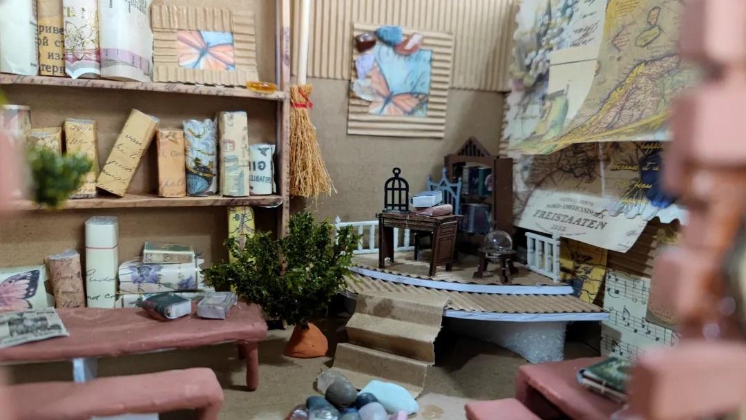 “复古的牛皮瓦楞纸包裹墙面,石砖堆砌的不规则入口,欢迎大家来到魔法教室!走过用魔法石铺的小路,是老师的讲台,地面双层的架空设计,打造魔法悬浮的视觉感;一面墙设计为贴满纸张的文化墙,另外两面是连体的落地书柜,里面堆满了用泡沫制作的书籍,两边是用彩泥制作的同学们的书桌,浓郁的学习氛围扑面而来;窗边种了一棵大树,四面环水,阳光从窗格照射进来,树影婆娑,温馨而神秘……整个创意灵感来源于哈利波特的魔法世界,小说中的世界令人神往,希望每个人都能拥有一个属于自己的秘密花园”