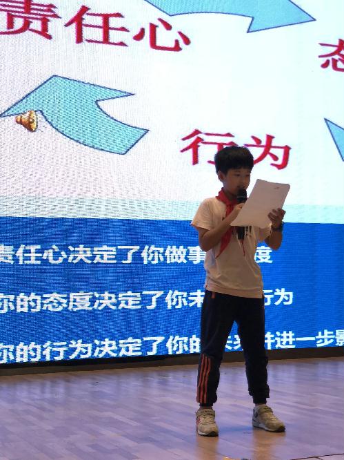 紧接着,各个班级推选的学生代表纷纷上台发言,不仅为同学们阐述了什么是责任心,更为大家提出了许多与之相关的宝贵建议。稚嫩的童声响起,为我们娓娓道来“责任心”的意义;稚气的脸庞扬起,心怀责任,眼中有光。在一片掌声中,集会圆满结束。