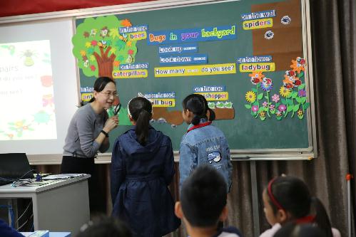 我校王老师坚持教学做合一的理念,让学生身临其境地学习了《Bugs in your backyard》。前半节课梳理文本,通过图片让孩子进行预测,在王老师的示范引导下,学生学会了自己说出绘本中的主要句型,让孩子试着扮演导游的角色,通过对话向大家介绍在后院的虫子。后半节课则是利用了Jig-saw-reading的方式,让孩子们分组完成,这一活动给了孩子自主选择的空间,同学们的积极性、自信心以及课堂的参与度都得到了进一步的提升。