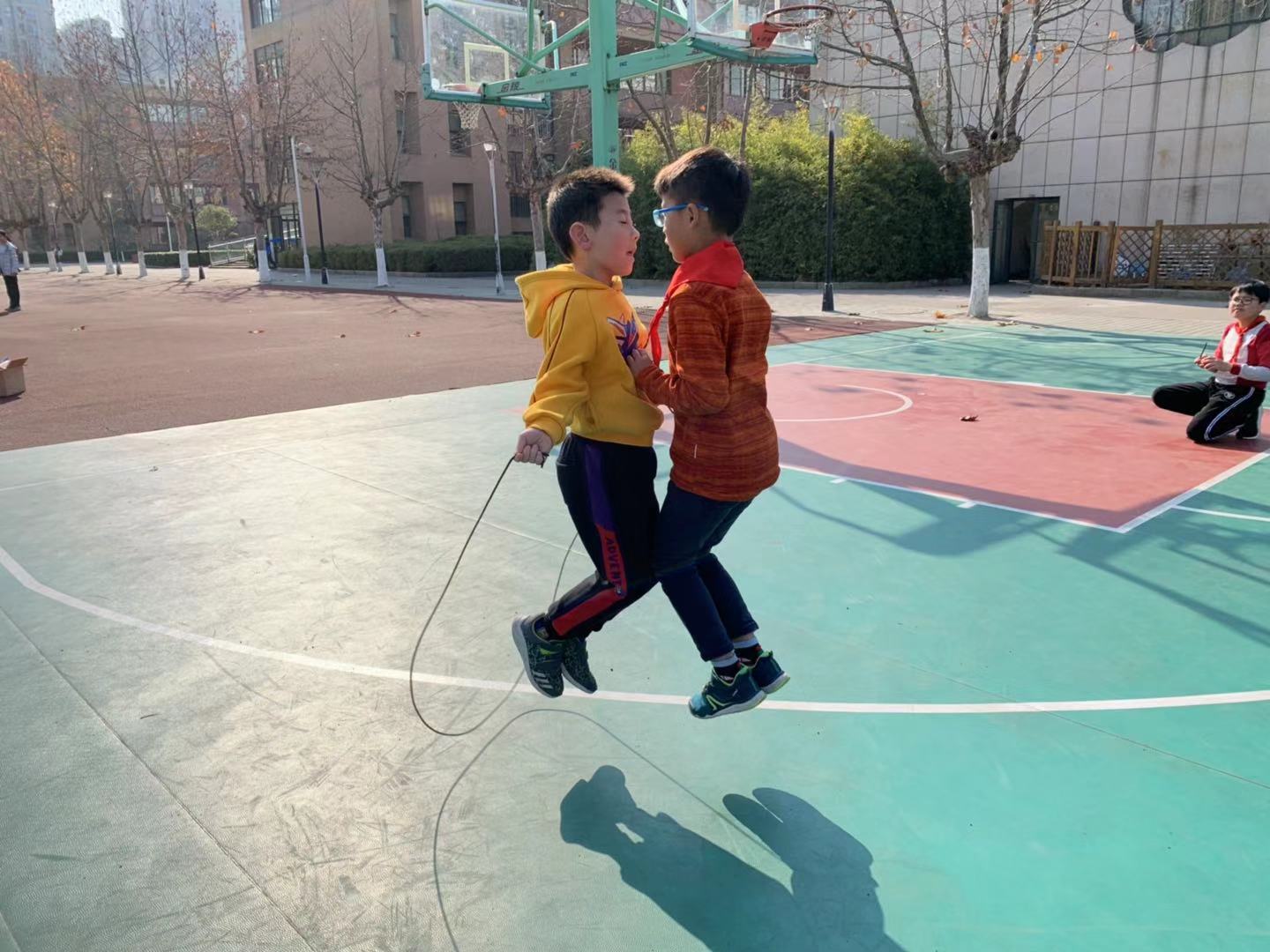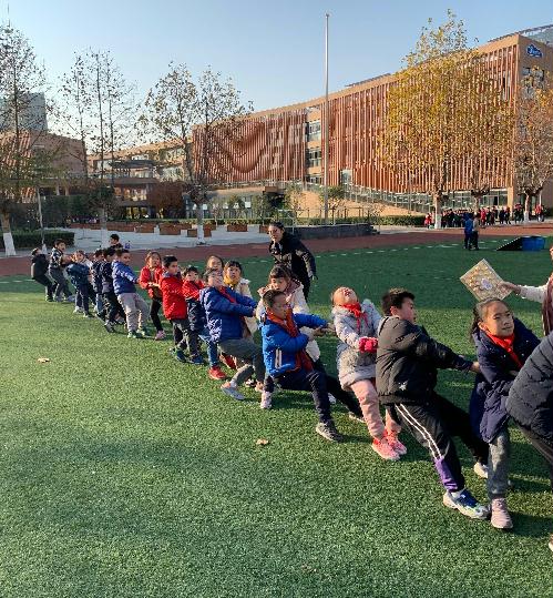 冬季锻炼好处多,学校开展的锻炼和比赛活动也丰富有趣,有长跑、拔河、单跳绳、各种花样跳绳……Let’s go! 一起来拔河赛场找找你熟悉的身影吧。随着裁判的哨音响起,同学们弓步蹬地、身体后倾,展开了一场艰难的拉锯战,“加油、加油”、“1、2、用力”,啦啦队的口号响彻操场上空。获得胜利的班级欢呼雀跃,暂时失利的班级也不气馁,握紧拳头互相鼓劲。比赛中孩子们坚持“友谊第一、比赛第二”的原则,诠释着“我运动、我快乐、我参与、我健康”的体育精神